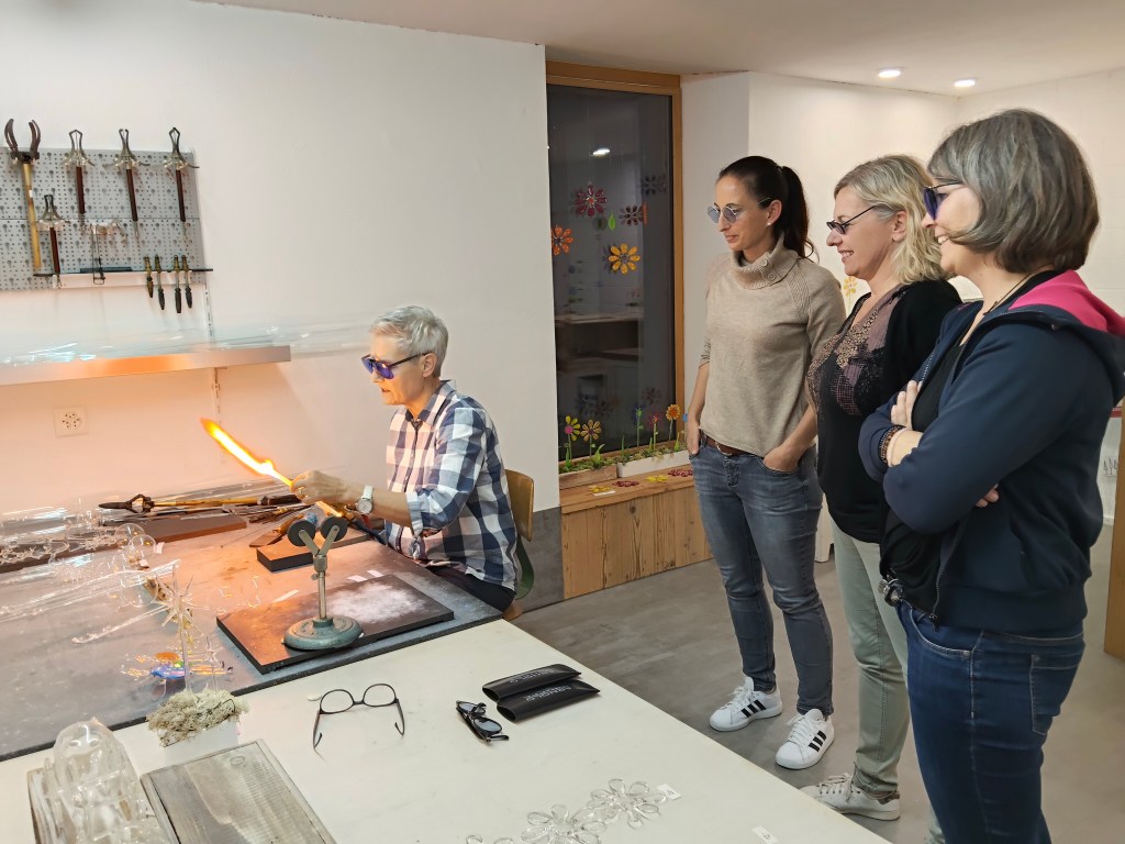 Im Oktober 2025 bekamen wir die Möglichkeit im Glashüsli Tomils, der Glasbläserin Karin Natter über die Schulter zu schauen und selbst einiges auszuprobieren.
