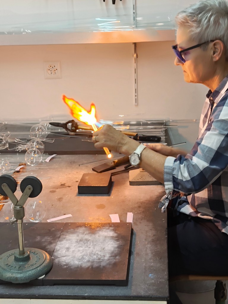 Während des Malens konnten wir nacheinander, mit Unterstützung von Karin, eine eigene Kugel blasen. Man durfte nicht zu fest blasen (sonst splittert die Kugel bei der kleinsten Berührung), aber doch genug, damit sich das Material dehnt. So hörte man im Hintergrund immer mal wieder ein «ned so viel» oder «meh meh meh» und wir mussten jeweils schmunzeln😃