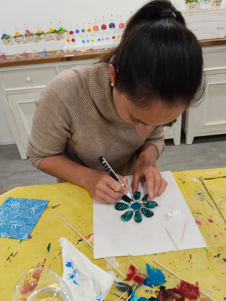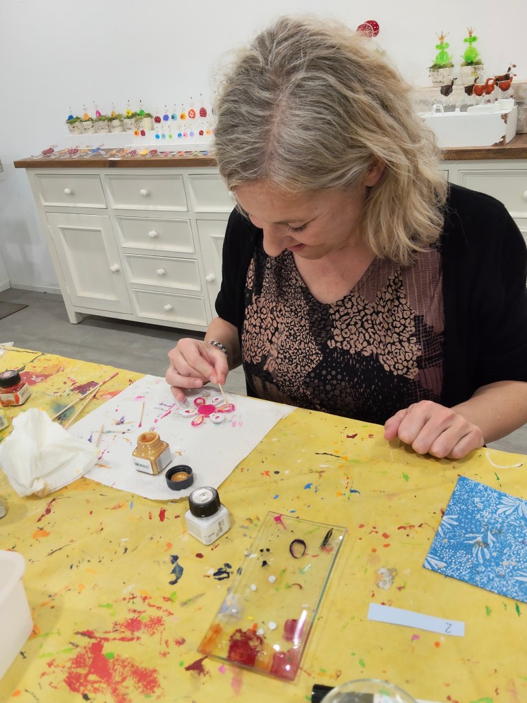 Nach einer kurzen Einführung durch Karin, durften wir vorbereitete Glasrohlinge kreativ anmalen. Dafür hat sie uns Engel und Blumen in verschiedenen Grössen vorbereitet.